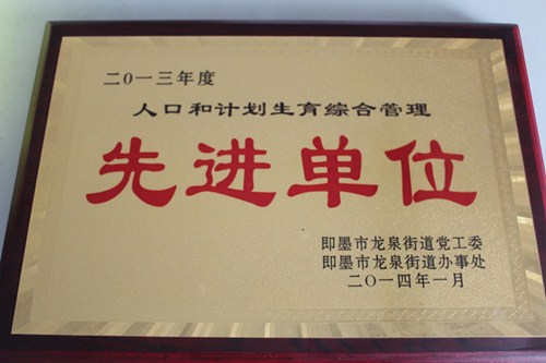 2014年1月20日在即墨市龍泉街道辦事處組織的“關(guān)于表彰2013年度科學(xué)發(fā)展先進(jìn)集體和先進(jìn)個(gè)人的通報(bào)”頒獎(jiǎng)儀式上,青島正大有限公司榮獲“2013年度人口和計(jì)劃生育綜合管理先進(jìn)單位”的殊榮。
