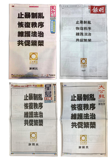 8月27日、8月29日,正大集團(tuán)資深董事長謝國民先生分別在香港《東方日報(bào)》《明報(bào)》《星島日報(bào)》《大公報(bào)》等新聞媒體上頭條整版發(fā)出了“止暴制亂 恢復(fù)秩序 維護(hù)法治 共促繁榮 正大集團(tuán)謝國民”的巨幅倡議,表明了一位知名海外華商華人對香港示威和暴力活動(dòng)的鮮明態(tài)度。